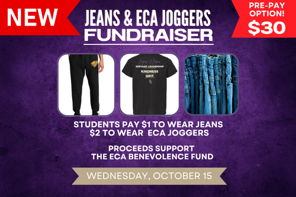 On select Jeans & Joggers Fundraiser Day, students can pay $1 to wear jeans or $2 to wear their ECA Joggers and wear this year's ECA Spirit Shirt.